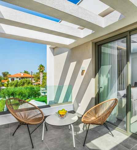 From the 2nd level there is access to the garden, where there is a large terrace with a dining area and living room. Directly in front of the terrace is an enchanting private pool, where the water is constantly flowing due to our uniquely designed waterfall. You can also enjoy a refreshing shower in the outdoor shower of Villa Olivia.