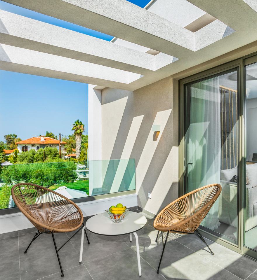 On the 3rd level, where the master suite is, you will find a King-Size double bed, ideal for couples, a large sofa and an en suite bathroom with a shower. The top floor also has two balconies with tables and chairs, so you can enjoy your coffee with different views.